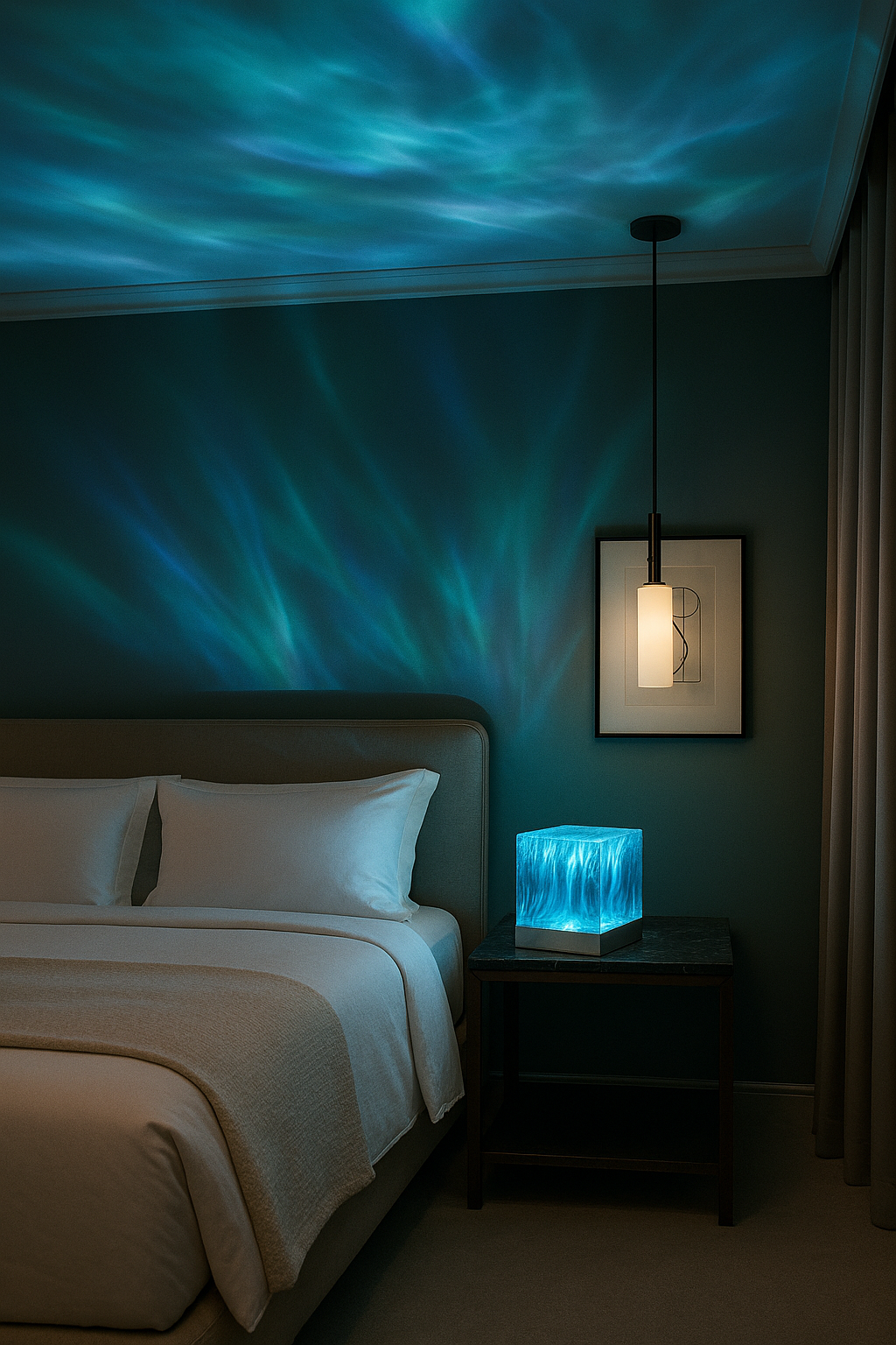 En un instant, vos murs et plafonds s’illuminent d’un ciel boréal coloré, transformant chaque pièce en un espace de détente et d’émerveillement.